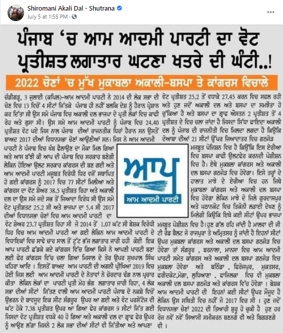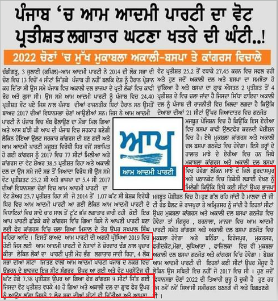 ਸੋਸ਼ਲ ਮੀਡੀਆ ਤੇ ਨਿਊਜ਼ ਪੇਪਰ ਦੀ ਕਲਿਪ ਵਾਇਰਲ ਹੋ ਰਹੀ ਹੈ ਜਿਸ ਦੇ ਮੁਤਾਬਕ ਪੰਜਾਬ ਵਿਚ ਆਮ ਆਦਮੀ ਪਾਰਟੀ (Aam Aadmi Party ) ਦਾ ਵੋਟ ਪ੍ਰਤੀਸ਼ਤ ਲਗਾਤਾਰ ਘਟਣਾ ਖਤਰੇ ਦੀ ਘੰਟੀ ਹੈ।