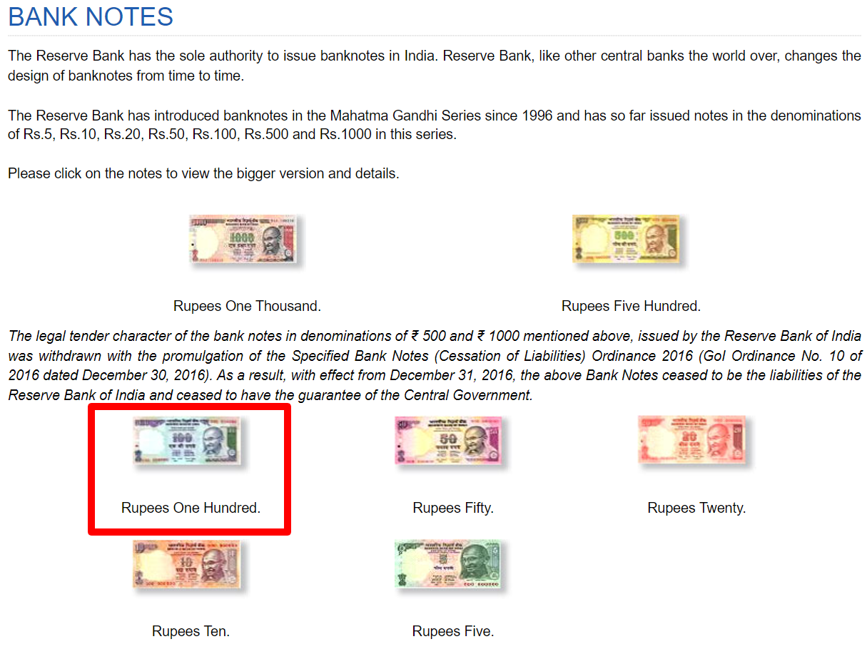 ਰਿਜ਼ਰਵ ਬੈਂਕ ਦੀ ਵੈਬਸਾਈਟ ‘ਤੇ ਵਰਤਮਾਨ ਵਿੱਚ ਚੱਲ ਰਹੇ ਨੋਟਾਂ ਦੀ ਸੂਚੀ ਨੂੰ ਦੇਖਣ ਤੋਂ ਬਾਅਦ ਅਸੀਂ ਪਾਇਆ ਕਿ 100 ਰੁਪਏ ਦੇ ਪੁਰਾਣੇ ਨੋਟ ਅਜੇ ਵੀ ਕਾਨੂੰਨੀ ਟੈਂਡਰ ਦੇ ਰੂਪ ਵਿੱਚ ਪ੍ਰਚਲਿਤ ਹਨ।