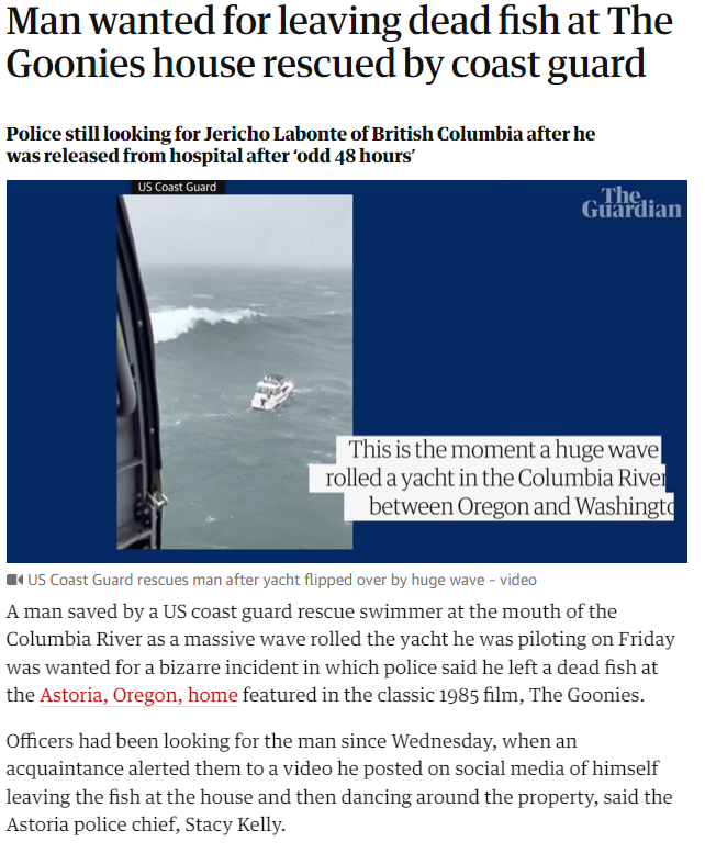 ਸਰਚ ਦੇ ਦੌਰਾਨ ਸਾਨੂੰ ਵਾਇਰਲ ਵੀਡੀਓ ਦਿ ਗਾਰਡੀਅਨ ਨਿਊਜ਼ ਦੀ ਵੈਬਸਾਈਟ ਤੇ ਪ੍ਰਕਾਸ਼ਿਤ ਆਰਟੀਕਲ ਦੇ ਵਿੱਚ ਅਪਲੋਡ ਮਿਲੀ। ਰਿਪੋਰਟ ਦੇ ਅਨੁਸਾਰ, ਯੂਐਸ ਕੋਸਟ ਗਾਰਡ ਨੇ ਓਰੇਗਨ ਅਤੇ ਵਾਸ਼ਿੰਗਟਨ ਦੇ ਵਿਚਕਾਰ ਕੋਲੰਬੀਆ ਨਦੀ ਤੋਂ ਇੱਕ ਵਿਅਕਤੀ ਨੂੰ ਬਚਾ ਲਿਆ ਜਦੋਂ ਉਸਦੀ ਕਿਸ਼ਤੀ ਤੇਜ਼ ਲਹਿਰਾਂ ਵਿੱਚ ਫਸ ਗਈ। ਰਿਪੋਰਟ ਵਿੱਚ ਇਹ ਵੀ ਦੱਸਿਆ ਗਿਆ ਹੈ ਕਿ ਸਮੁੰਦਰੀ ਲਹਿਰਾਂ ਤੋਂ ਬਚੇ ਵਿਅਕਤੀ ਦੀ ਪਛਾਣ ਬ੍ਰਿਟਿਸ਼ ਕੋਲੰਬੀਆ ਦੇ 35 ਸਾਲਾ ਜੈਰੀਕੋ ਲੈਬੋਨਟੇ ਵਜੋਂ ਹੋਈ ਹੈ, ਜਿਸ ਬਾਰੇ ਪੁਲਿਸ ਦਾ ਕਹਿਣਾ ਹੈ ਕਿ ਲੈਬੋਨਟੇ ਤੇ ਕਈ ਮਾਮਲੇ ਹਨ ਅਤੇ ਉਸਨੂੰ ਦੋਸ਼ੀ ਕਰਾਰ ਦਿੱਤਾ ਗਿਆ ਹੈ। ਦੱਸ ਦਈਏ ਕਿ ਇਹ ਹਾਦਸਾ 3 ਫਰਵਰੀ 2023 ਨੂੰ ਹੋਇਆ ਸੀ।