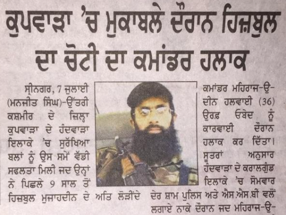 ਜੰਮੂ ਕਸ਼ਮੀਰ ਦੇ ਹੰਦਵਾੜਾ ਵਿੱਚ ਮੰਗਲਵਾਰ ਦੇਰ ਰਾਤ ਅਤਿਵਾਦੀਆਂ ਦੇ ਨਾਲ ਹੋਈ ਮੁੱਠਭੇੜ ਵਿੱਚ ਭਾਰਤੀ ਸੁਰੱਖਿਆਬਲਾਂ ਨੇ ਹਿਜ਼ਬੁਲ ਕਮਾਂਡਰ (Hizbul Commander) ਮੇਹਰਾਜੁਦੀਨ ਹਲਵਾਈ ਉਰਫ਼ ਉਬੇਦ ਨੂੰ ਮਾਰ ਗਿਰਾਇਆ। ਭਾਰਤੀ ਸੁਰੱਖਿਆਬਲਾਂ ਨੂੰ ਲੰਮੇ ਸਮੇਂ ਤੋਂ ਮੇਹਰਾਜੁਦੀਨ ਹਲਵਾਈ ਦੀ ਤਲਾਸ਼ ਸੀ। ਮੇਹਰਾਜੁਦੀਨ ਸਾਲ 2012 ਤੋਂ ਉੱਤਰੀ ਕਸ਼ਮੀਰ ਵਿੱਚ ਅਤਿਵਾਦੀ ਗਤੀਵਿਧੀਆਂ ਨੂੰ ਅੰਜਾਮ ਦਿੰਦਾ ਆ ਰਿਹਾ ਸੀ। ਸੁਰੱਖਿਆਬਲਾਂ ਦੀ ਮੋਸਟ ਵਾਂਟਿਡ ਸੂਚੀ ਵਿੱਚ ਉਹ ਚੌਥੇ ਨੰਬਰ ਤੇ ਸੀ।