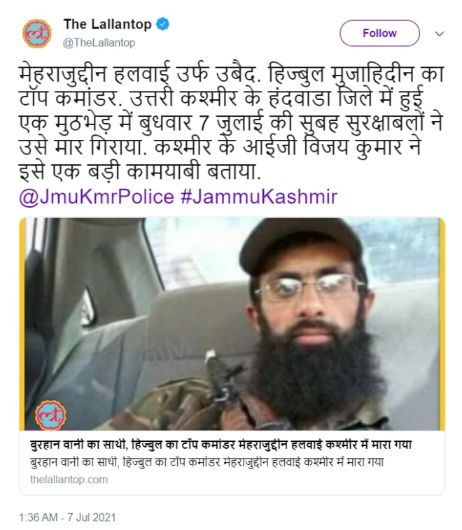ਇਸ ਨਾਲ ਹੀ ਟੀ ਵੀ 9 ਭਾਰਤਵਰਸ਼, ਪੱਤ੍ਰਿਕਾ, ਦੈਨਿਕ ਜਾਗਰਣ, ਇੰਡੀਅਨ ਐਕਸਪ੍ਰੈਸ,ਹਿੰਦੁਸਤਾਨ ਟਾਈਮਜ਼ ਅਤੇ ਫੈਕਟ ਚੈਕਿੰਗ ਵੈੱਬਸਾਈਟ ਲਲਨਟੌਪ ਨੇ ਵੀ ਇਸ ਤਸਵੀਰ ਨੂੰ ਪ੍ਰਕਾਸ਼ਿਤ ਕਰਦੇ ਹੋਏ ਇਸ ਨੂੰ ਹਿਜ਼ਬੁਲ ਮੁਜਾਹਿਦੀਨ ਦਾ ਕਮਾਂਡਰ ਮੇਹਰਾਜੁਦੀਨ ਹਲਵਾਈ ਦੱਸਿਆ ਹੈ।