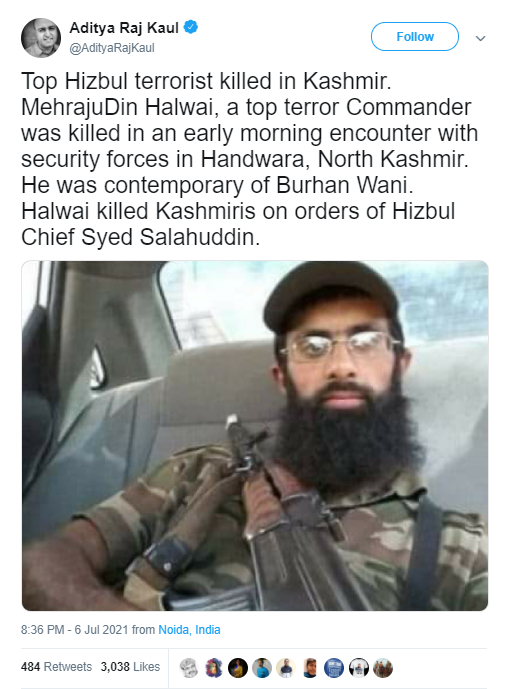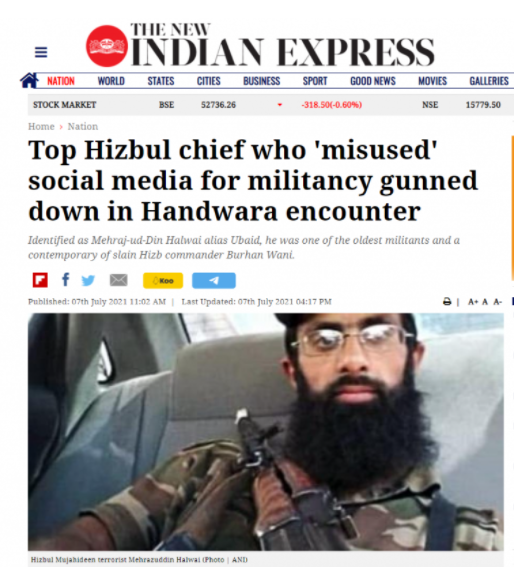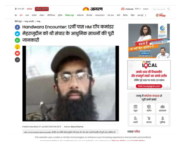 ਮੇਹਰਾਜੁਦੀਨ ਹਲਵਾਈ ਦੇ ਐਨਕਾਊਂਟਰ ਦੀ ਖ਼ਬਰ ਤੋਂ ਬਾਅਦ ਮੇਨ ਸਟ੍ਰੀਮ ਮੀਡੀਆ ਨੇ ਇਸ ਤਸਵੀਰ ਨੂੰ ਪ੍ਰਕਾਸ਼ਤ ਕਰਦੇ ਹੋਏ ਫੋਟੋ ਵਿਚ ਨਜ਼ਰ ਆ ਰਹੇ ਵਿਅਕਤੀ ਨੂੰ ਹਿਜ਼ਬੁਲ ਮੁਜਾਹਿਦੀਨ ਦਾ ਕਮਾਂਡਰ ਦੱਸਿਆ।