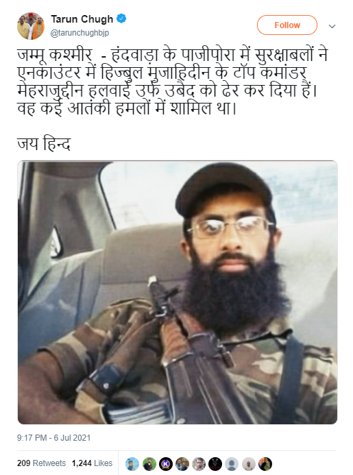 ਇਸ ਦੇ ਨਾਲ ਹੀ ਬੀਜੇਪੀ ਨੇਤਾ ਤਰੁਣ ਚੁੱਘ ਨੇ ਵੀ ਇਸ ਤਸਵੀਰ ਨੂੰ ਆਪਣੇ ਅਧਿਕਾਰਕ ਟਵਿੱਟਰ ਅਕਾਉਂਟ ਤੇ ਸ਼ੇਅਰ ਕੀਤਾ। ਇਸ ਦੇ ਨਾਲ ਹੀ ਸੀਐਨਐਨ ਨਿਊਜ਼ 18 ਦੇ ਐਡੀਟਰ ਅਦਿੱਤਿਆ ਰਾਜ ਕਾਲ ਨੇ ਵੀ ਇਸ ਤਸਵੀਰ ਨੂੰ ਕਸ਼ਮੀਰ ਮੁੱਠਭੇਡ਼ ਵਿੱਚ ਮਾਰੇ ਗਏ ਕਮਾਂਡਰ ਮੇਹਰਾਜੁਦੀਨ ਹਲਵਾਈ ਦੀ ਦੱਸਿਆ ਹੈ।