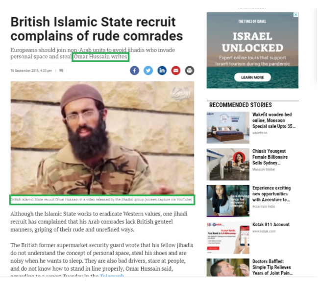 ਅਮਰੀਕੀ ਵੈੱਬਸਾਈਟ ਇੰਡੀਪੈਂਡੈਂਟ ਨੇ ਵੀ ਇਸ ਤਸਵੀਰ ਨੂੰ ਪ੍ਰਕਾਸ਼ਿਤ ਕਰਦੇ ਹੋਏ ਵਿਅਕਤੀ ਨੂੰ ਇਸਲਾਮਿਕ ਸਟੇਟ ਦਾ ਇਕ ਅਤਿਵਾਦੀ ਉਮਰ ਹੁਸੈਨ ਦੱਸਿਆ ਹੈ।
