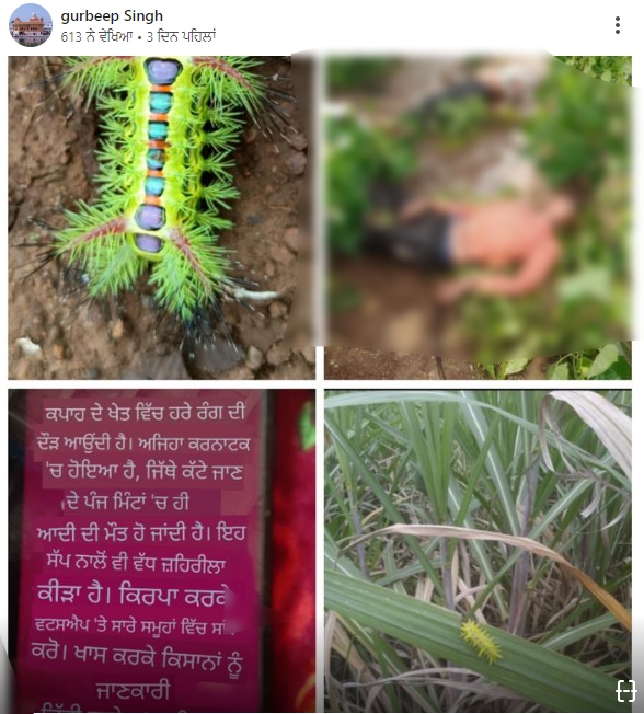 ਸੋਸ਼ਲ ਮੀਡੀਆ ਤੇ ਇਨ੍ਹੀਂ ਦਿਨੀਂ ਇਕ ਕਲਾਜ਼ ਵਾਇਰਲ ਹੋ ਰਿਹਾ ਹੈ ਜਿਸ ਵਿੱਚ ਤਿੰਨ ਤਸਵੀਰਾਂ ਹਨ। ਇਕ ਤਸਵੀਰ ਦੇ ਵਿੱਚ ਹਰੇ ਰੰਗ ਦਾ ਕੀੜਾ ਦਿਖਾਈ ਦੇ ਰਿਹਾ ਹੈ ਜਦਕਿ ਦੂਜੀ ਤਸਵੀਰ ਵਿਚ ਦੋ ਲਾਸ਼ਾਂ ਅਤੇ ਤੀਜੀ ਤਸਵੀਰ ਦੇ ਵਿੱਚ ਇੱਕ ਮੋਬਾਇਲ ਦੀ ਸਕਰੀਨ ਤੇ ਮੈਸੇਜ ਲਿਖਿਆ ਹੋਇਆ ਹੈ। ਵਾਇਰਲ ਹੋ ਰਹੇ ਕੋਲਾਜ ਨੂੰ ਸ਼ੇਅਰ ਕਰ ਸ਼ੋਸਲ ਮੀਡੀਆ ਯੂਜ਼ਰ ਕੀੜੇ ਤੋਂ ਸਾਵਧਾਨ ਰਹਿਣ ਦੀ ਗੱਲ ਕਹਿ ਰਹੇ ਹਨ। ਦਾਅਵਾ ਕੀਤਾ ਜਾ ਰਿਹਾ ਹੈ ਕਿ ਇਸ ਕੀੜੇ ਦੀ ਕੱਟਣ ਤੋਂ ਤੁਰੰਤ ਬਾਅਦ ਮੌਤ ਹੋ ਜਾਂਦੀ ਹੈ। ਇਸ ਦਾਅਵੇ ਨੂੰ ਪਹਿਲਾਂ Newschecker Hindi ਦੁਆਰਾ ਫੈਕਟ ਚੈਕ ਕੀਤਾ ਜਾ ਚੁੱਕਾ ਹੈ।