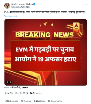 ਸੋਸ਼ਲ ਮੀਡੀਆ ਤੇ ਇੱਕ ਵੀਡੀਓ ਵਾਇਰਲ ਹੋ ਰਹੀ ਹੈ ਜਿਸ ਵਿੱਚ ਈ ਵੀਐਮ ਦੀ ਖਰਾਬੀ ਬਾਰੇ ਦੱਸਿਆ ਗਿਆ ਹੈ। ਵੀਡੀਓ ਨਾਲ ਕੈਪਸਨ ਵਿੱਚ ਲਿਖਿਆ ਹੈ,’ਈਵੀਐਮ ਵਿੱਚ ਖਰਾਬੀ ਹੈ। ਜੇਕਰ ਅੱਜ ਬੈਲਟ ਪੇਪਰ ‘ਤੇ ਚੋਣਾਂ ਹੋਈਆਂ ਤਾਂ ਭਾਜਪਾ ਖਤਮ ਹੋ ਜਾਵੇਗੀ। ਇਹ ਵੀਡੀਓ ਸਾਲ 2017 ਦਾ ਹੈ। ਮੱਧ ਪ੍ਰਦੇਸ਼ ਦੇ ਭਿੰਡ ਜ਼ਿਲ੍ਹੇ ਦੀ ਅਟੇਰ ਵਿਧਾਨ ਸਭਾ ਵਿੱਚ ਉਪ ਚੋਣ ਤੋਂ ਪਹਿਲਾਂ ਈਵੀਐਮ ਵਿੱਚ ਖ਼ਰਾਬੀ ਪਾਈ ਗਈ ਸੀ ਜਿਸ ਤੋਂ ਬਾਅਦ ਹੋਏ ਵਿਵਾਦ ਨੂੰ ਹਾਲੀਆ ਲੋਕ ਸਭਾ ਚੋਣਾਂ ਨਾਲ ਜੋੜਕੇ ਸ਼ੇਅਰ ਕੀਤਾ ਜਾ ਰਿਹਾ ਹੈ।