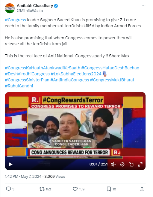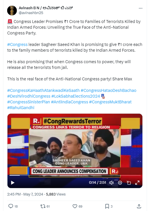 A video showing Congress leader Haji Sagheer Saeed Khan accusing the BJP of killing “innocent” people in Kashmir, and promising compensation to the deceased’s families is being widely circulated on social media platforms amid the Lok Sabha Polls. Multiple users shared the video stating that the Congress leader is “promising to give ₹1 crore each to the family members of terrorists killed by Indian Armed Forces,” and claiming that it unveils the “true face” of the grand old party. Newschecker found that the video has been shared out of context.
