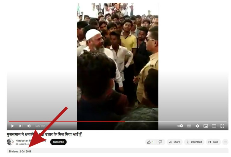 A keyword search on YouTube for “ वर्दी उतार के मिल,” – phrase heard in the footage, yielded a video by Hindustan Right of voice, dated October 2, 2018. It featured a longer version of the viral video, with the title ‘मुसलमान ने धमकी दी वर्दी उतार के मिल मिया भाई हूँ.’