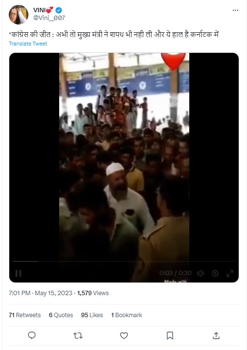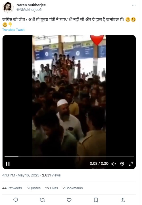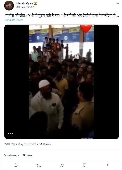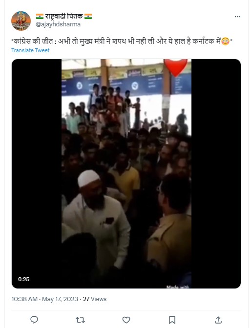 A video of a man, wearing a skull cap, openly threatening a uniformed police personnel swamped by a huge crowd is going viral on social media platforms. Those who shared the footage linked it to the Congress’ recent win in the Karnataka assembly polls, insinuating that it has ‘emboldened’ the community members to be brazen. Multiple Twitter users shared the 30-second-long-clip claiming, “Congress Wins: The Chief Minister has not even taken oath yet and this is the situation in Karnataka.” (translated from Hindi) Newschecker found the claim to be untrue. The video is neither recent, nor from Karnataka.