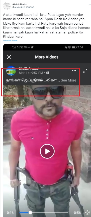 One of the other posts read “நாங்கள் ஜெய்ஸ்ரீராம் புலிகள்” (We are Jai Shri Ram tigers), with a screenshot of the same video. On checking Facebook for the same caption, we came across several posts of the same video with the similar captions. On analysing the comments section of one of the videos, we were able to gather that the man was from Lucknow and was arrested following the video.