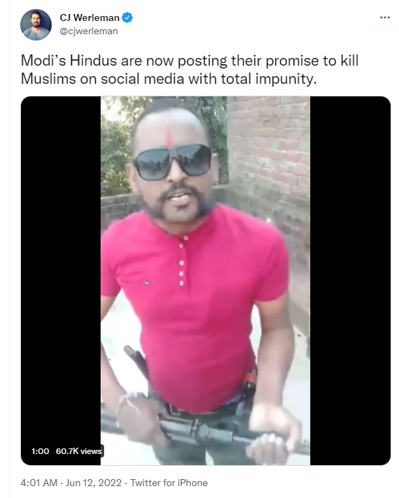 Controversial ‘journalist’ CJ Werleman was among those who tweeted the video, with the caption “Modi’s Hindus are now posting their promise to kill Muslims on social media with total impunity”. His tweet has received over 3,000 likes and over 2,500 retweets.