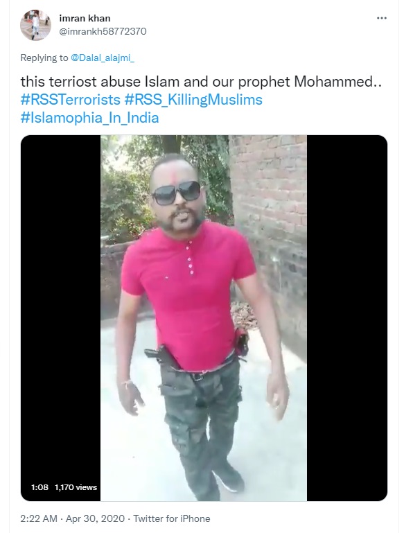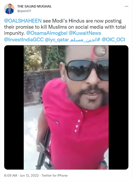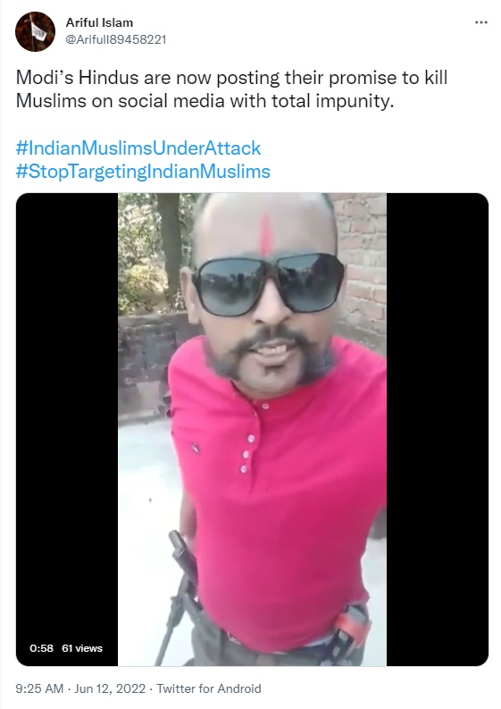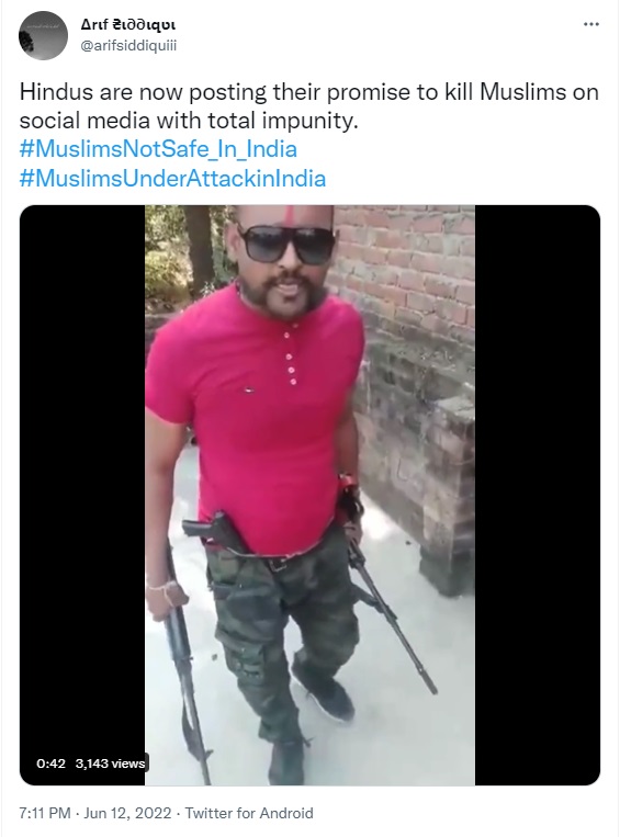 In the wake of protests over the insult of Prophet Mohammad by suspended BJP spokesperson Nupur Sharma, several Twitter users are sharing a 1 minute long video of a man threatening to shoot Muslims. Dressed in bright pink T-shirt and sporting a handlebar moustache, the man appears to be standing on a rooftop and can be seen brandishing guns and firing in the air to show that the weapons are real and not fake. Claiming this to be a recent video, users are citing it to be an example of the impunity enjoyed by anti-Muslim voices in the country. Newschecker has found that the video is at least 2 years old.
