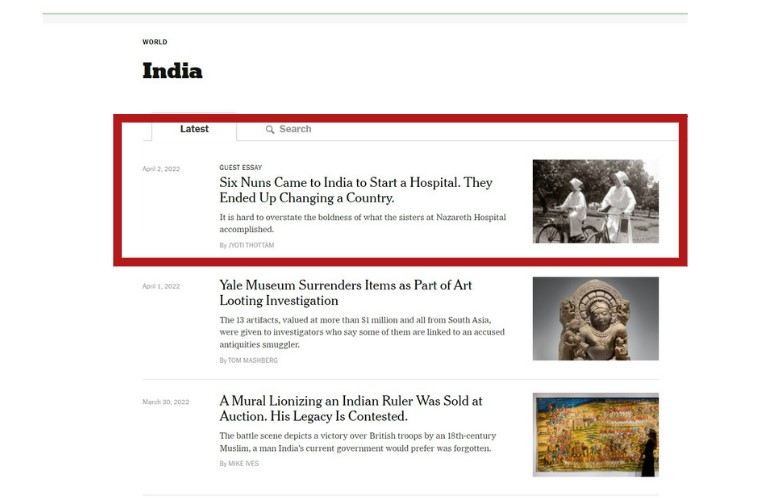 Notably, the only article published on April 2, 2022 in the ‘India’ section in the website was a guest essay titled ‘Six Nuns Came to India to Start a Hospital. They Ended Up Changing a Country.’