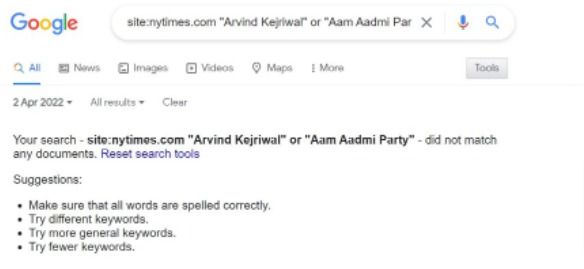 To verify the authenticity of the alleged screenshot of the New York Times article stating that “Aam Aadmi Party sets world record of gathering highest number of people in a political rally”, we looked up keywords “Arvind Kejriwal” Or “Aam Aadmi Party” on Google and set the time frame on April 2, 2022 – the date line in the viral image shows Saturday, April 2, 2022- using advanced operators. However, we didn’t find any such report published by the NYT on April 2.