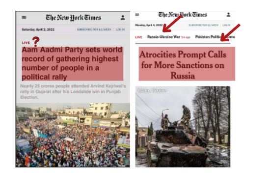 Delhi Chief Minister Arvind Kejriwal and newly elected Punjab Chief Minister Bhagwant Mann, on Saturday, held a roadshow at Ahmedabad in Gujarat- where assembly elections are scheduled later this year, where the party hopes to repeat its Punjab win. Soon after, an image, allegedly showing a screenshot from the website of The New York Times, went viral on social media platforms stating “Aam Aadmi Party sets world record of gathering highest number of people in a political rally”. Newschecker found the claim to be untrue.