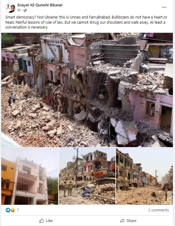 Three out of the four images claiming to show anti-encroachment drive in Uttar Pradesh’s Unnao under Yogi government are actually from 2016 when the Akhilesh Yadav-led SP was in power in the state. However, we were not able to find verify the authenticity of the fourth imaged shared by Khurshid.