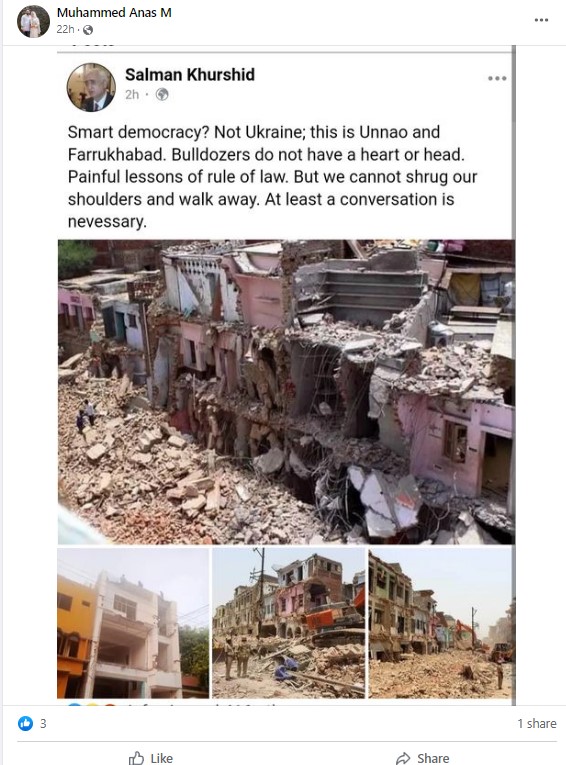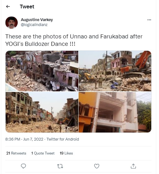 Khurshid tweeted four images with the caption, “Not Ukraine, these are photos of Unnao and Farrukhabad of Buldozerland,” on June 7, 2022. His post has been retweeted over 4,700 times and liked by more than 14K users so far. An archived version of the same can be found here.