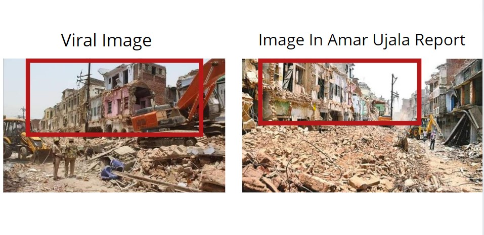 Another Amar Ujala report on the same incident, dated May 28, 2016, carried an image with the caption which roughly translates to “Encroachment Drive.” On Comparing the image with the viral one, we found some similarities between them like the building and the presence of a tree behind the pink building.
