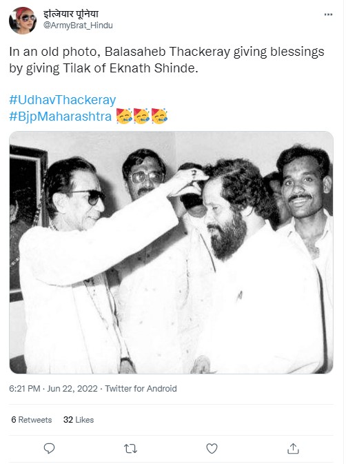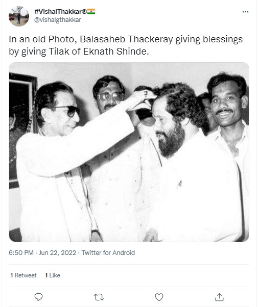 Several Twitter users shared the photograph with the claim “Balasaheb Thackeray giving blessings to Eknath Shinde.”