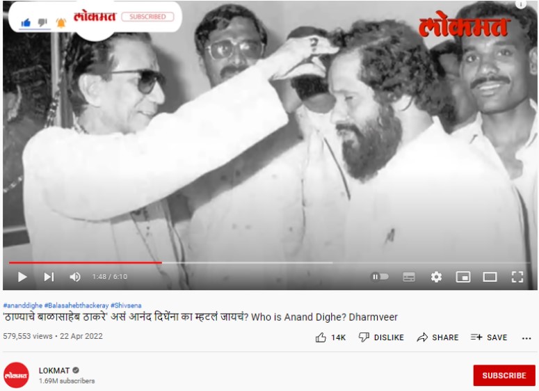 We also came across a video uploaded on the official channel of Lokmat on April 22, 20222 with the title “Why should Anand Dighe be called ‘Balasaheb Thackeray of Thane’? |Who is Anand Dighe? Dharmveer.” 1:48 minutes into the video, we found the viral image. The man seen in the photograph with Balasaheb Thackeray was identified as Anand Dighe.