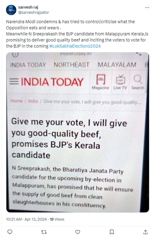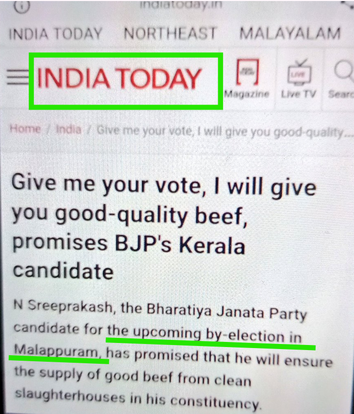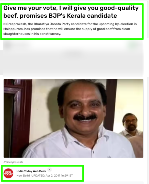 Its title read, “Give me your vote, I will give you good-quality beef, promises BJP’s Kerala candidate.” The subheading stated, “N Sreeprakash, the Bharatiya Janata Party candidate for the upcoming by-election in Malappuram, has promised that he will ensure the supply of good beef from clean slaughterhouses in his constituency,” were the same as seen in the image.