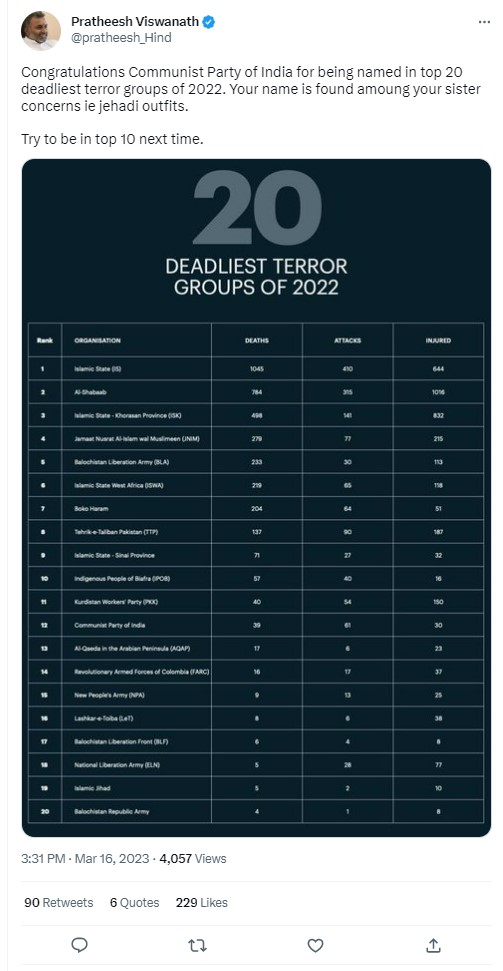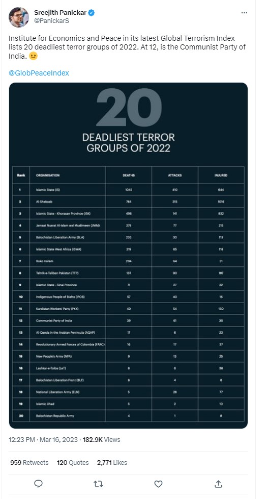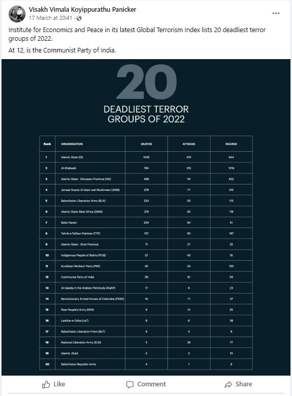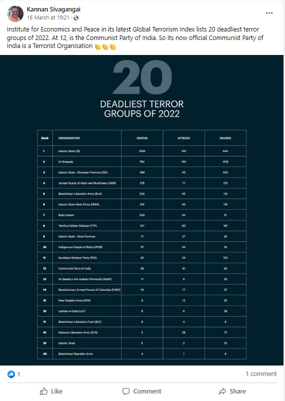 A graphic listing the Communist Party of India (CPI) as the 12th most deadliest terror group of 2022 is going viral on social media platforms with users alleging that the left-wing political party is now “officially a terrorist organisation.”
