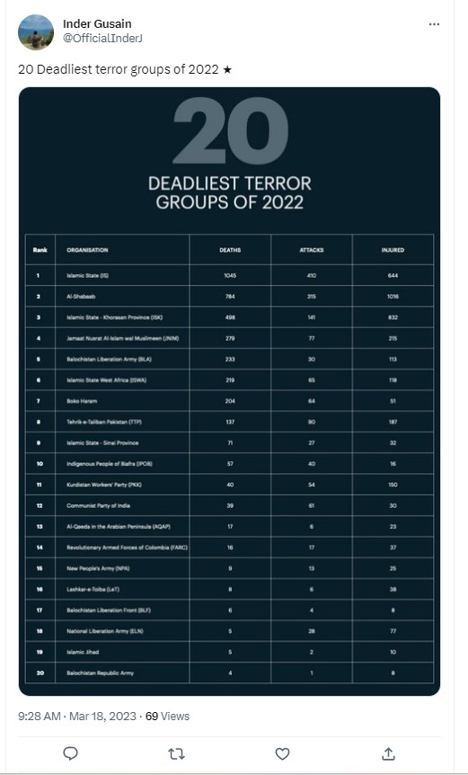 The image purportedly listing 20 deadliest terror groups of 2022 further states that ‘the party’ was responsible for 39 deaths and 30 injuries in 61 attacks last year. Newschecker found that the CPI was earlier erroneously featured in the recent Global Terrorism Index report, instead of the CPI (Maoist).