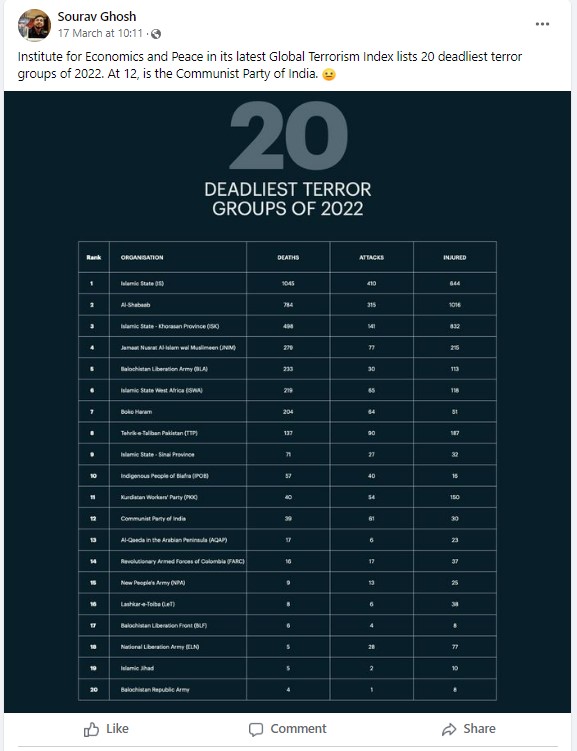 In the viral image, Communist Party Of India is ranked 12th in the list of 20 deadliest terror groups of 2022, whereas the Global Terrorism Index 2023 report featured Communist Party of India (Maoist) in that spot.