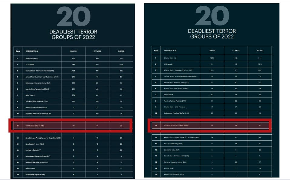 Communist Party of India ranked 12th in the list of the deadliest terror groups of 2022.