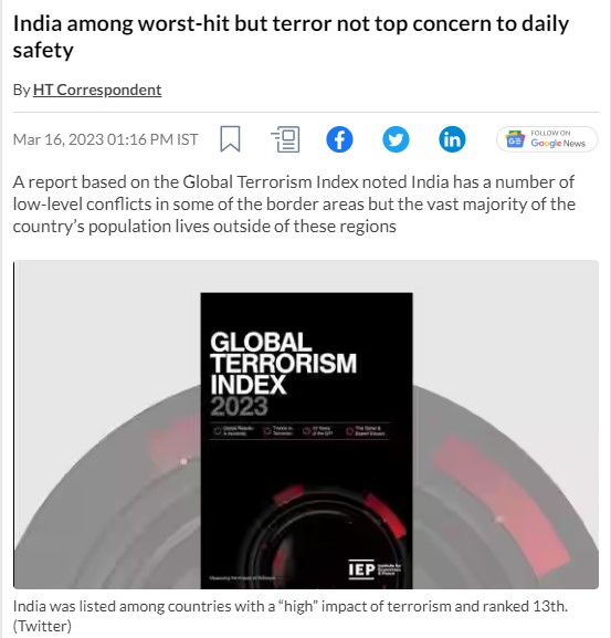 The report was based on the Global Terrorism Index released by the Institute for Economics & Peace (IEP) and noted that while India has a number of low-level conflicts in some border areas, the majority of the country’s population lives outside these regions. Adding, “The report listed the Communist Party of India (Maoist) as the 12th deadliest terror group in 2022 ahead of al-Qaeda in the Arabian Peninsula (13th) and Lashkar-e-Taiba (16th).”