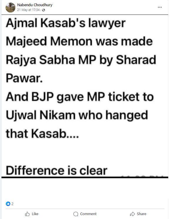 We could thus conclude that the viral claim is partly false. While BJP’s Lok Sabha Candidate Ujjwal Nikam did argue in favour of death penalty to terrorist Kasab, there is no evidence to show that former NCP leader Memon represented him in any stage of the trial.