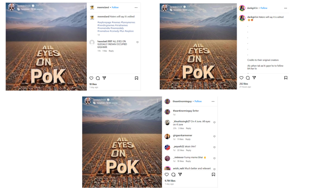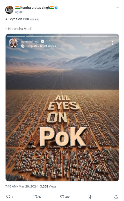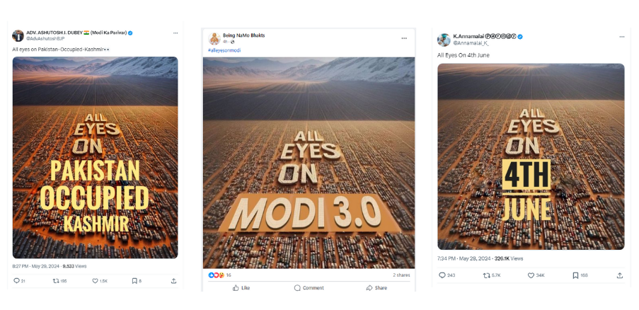 As the ‘All Eyes on Rafah” trend created a buzz on social media platforms, we noticed a number of Indian users sharing altered versions of the original template introduced in solidarity with the victims of Rafah. While some modified it to show “All eyes on PoK,” others linked it to “Kashi,” “Mathura” and even “Modi 3.0”