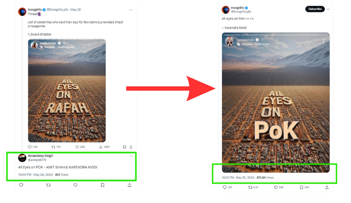 The phrase “All eyes on PoK,” and “Narendra Modi” was first found on X in the comment section of a post by @Incognito_qfs at 10:09 PM on May 28. We noticed that the widely circulated image was first shared on X by @Incognito_qfs at 10:33 PM on May 28.