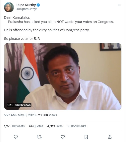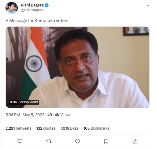 It carried a longer version of the viral footage where Raj can be heard saying, “Look at the dirty politics this congress is doing in Bangalore Central. A man who claims to be Rizwan’s PA. His name is Mazhar Ahmed. He has taken a photograph of me and Rizwan attending a candidate’s meeting and then has said Prakash Raj is supporting Congress. So don’t waste your vote on Congress. I have not joined any political party and I am an independent. And I seriously take offence of this dirty politics, stooping down of Congress party and Rizwan. Have given an election complaint. Please don’t believe in such rumours”.