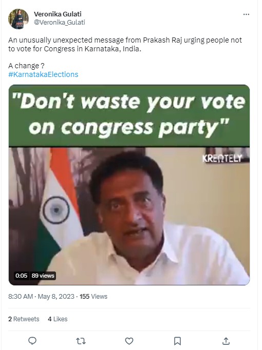 A video of Prakash Raj urging people not to “waste vote on Congress” is being widely shared online days ahead of the Karnataka polls. In the thirteen-second-long-video, the actor can be heard saying, “So don’t waste your vote on Congress. I have not joined any political party and I am an independent. And I seriously take offence of this dirty politics, stooping down of Congress party.” Newschecker found that the video is four-year-old, and that it is being shared out of context.