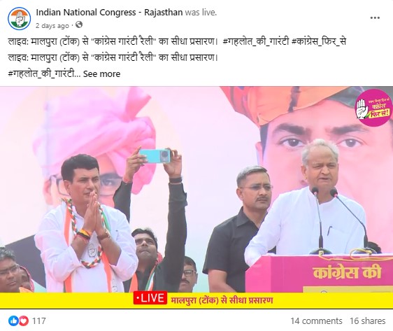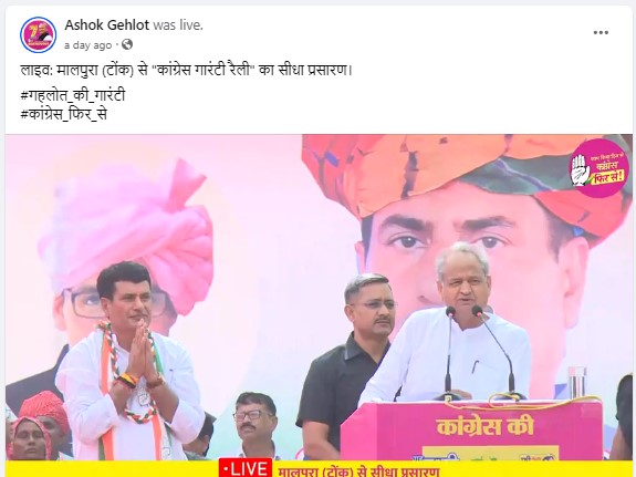 One such page was the official Facebook account of Ashok Gehlot on November 22, 2023, and the caption revealed that it was from a poll campaign in Malpura Assembly in Tonk district.