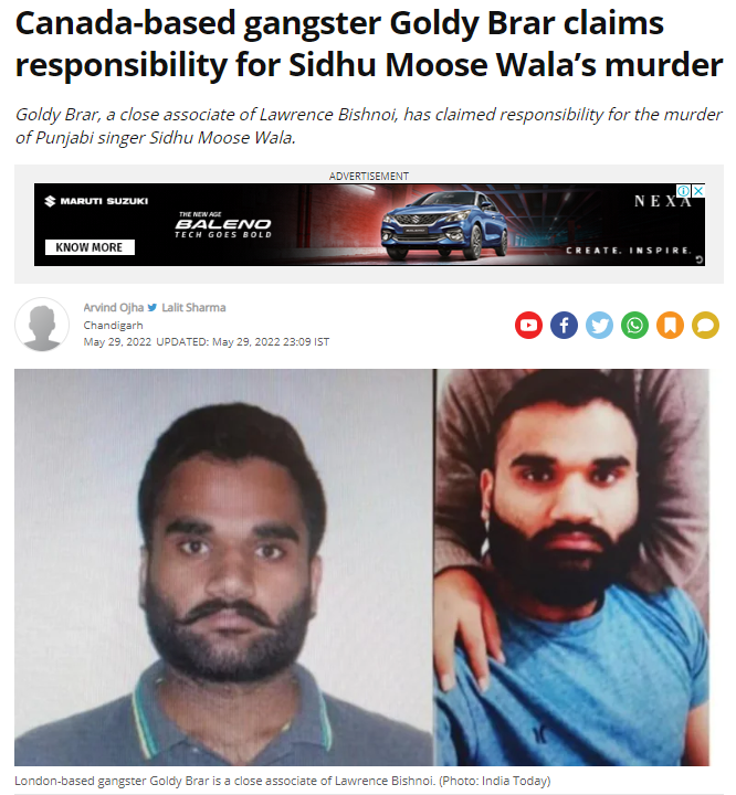After the murder, Goldy Brar, a gangster based in Canada, took responsibility for the murder by posting on Facebook .