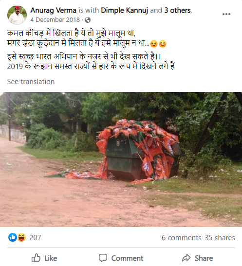 Upon searching with the caption ‘कमल कीचड़ मे खिलता है ये तो मुझे मालूम था, मगर झंडा कूड़ेदान मे मिलता है ये हमे मालूम न था‘, Newschecker found a post on Facebook with the same image also shared on Dec 4, 2018.