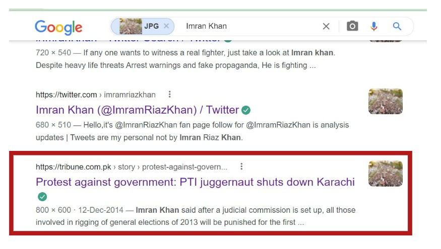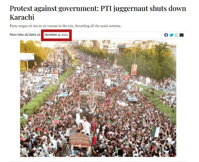 To ascertain whether the viral image shows PTI’s recent ‘Azadi March’ in Islamabad, we conducted a Google reverse image search on the image that led us to an article published in The Express Tribune website on December 12, 2014 with the title ‘Protest against government: PTI juggernaut shuts down Karachi.’