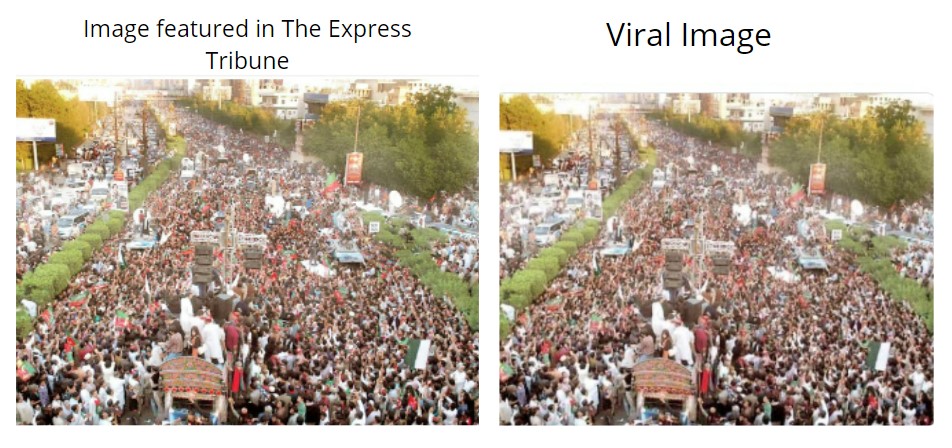 The article featured the same viral image and stated, “Thousands of people swamped the streets of Karachi on Friday in support of Pakistan Tehreek-e-Insaf (PTI) chief Imran Khan, as the party’s first attempt to shut down the city remained fairly successful with traffic off the roads and many markets closed.”