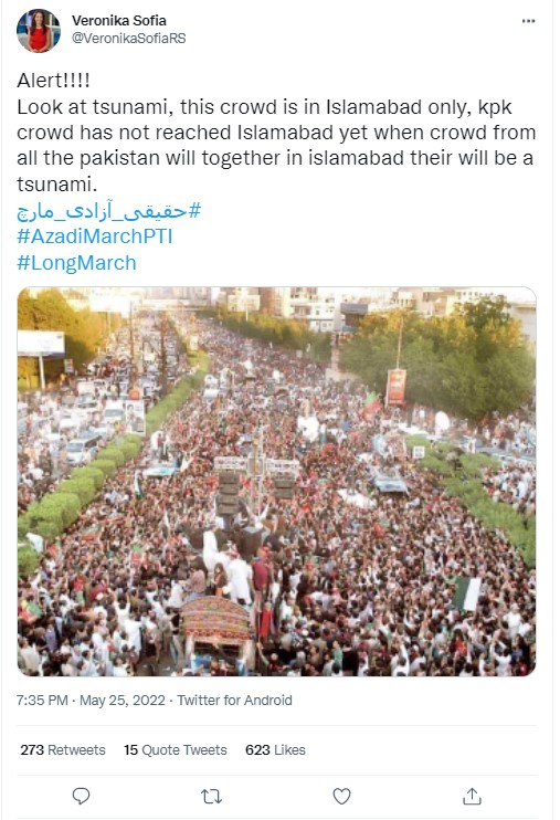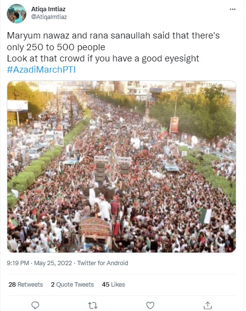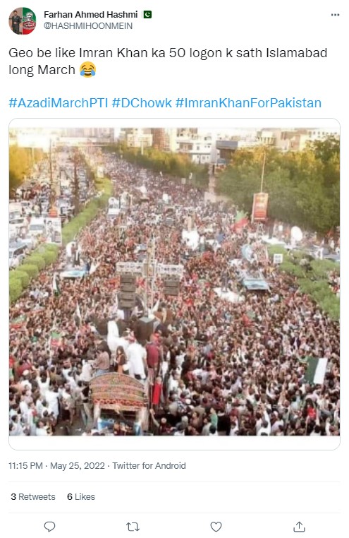 Among the users who shared the image, and claimed that it showed the recent protest in Islamabad was the handle @Malhachimi, whose tweet on May 25, 2022 gained close to 3000 retweets and over 6,500 likes. Archived version of the same can be seen here.