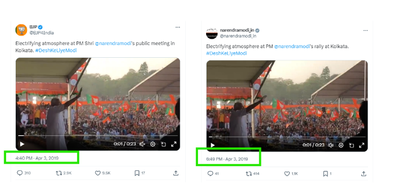 We found that a slightly shorter version of the same footage was uploaded on the X handle of Narendra Modi on April 3, 2019 to show “Electrifying atmosphere” PM Modi’s Kolkata rally. The same video was shared by the BJP to show visuals from PM Modi’s public meeting in Kolkata ahead of the 2019 Lok Sabha Polls.