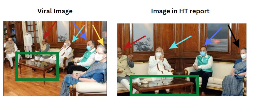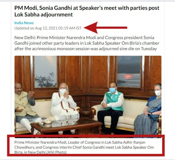 It carried a photograph showing PM Modi, Sonia Gandhi and other leaders in the same attire, sitting arrangement and identical background as seen in the viral image. The report stated, “Prime Minister Narendra Modi and Congress president Sonia Gandhi joined other party leaders in Lok Sabha Speaker Om Birla’s chamber after the acrimonious monsoon session was adjourned sine die… The two leaders, however, didn’t speak to each other, according to two leaders present in the meeting.”