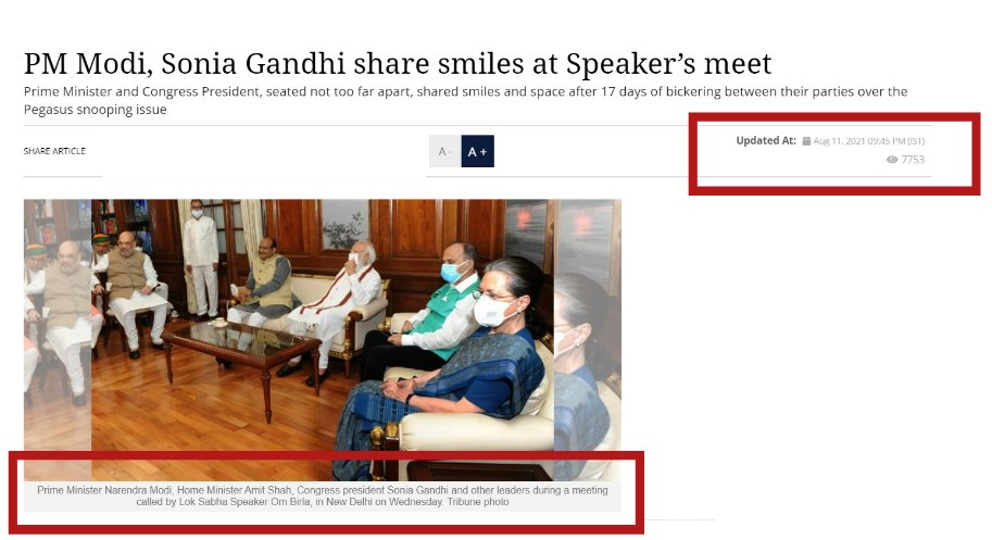 Following this, we conducted a keyword search for “Modi,” “Sonia Gandhi” “meet” Lok Sabha adjournment” & “August 2021” on Google which yielded a report by The Tribune, dated August 11, 2021.