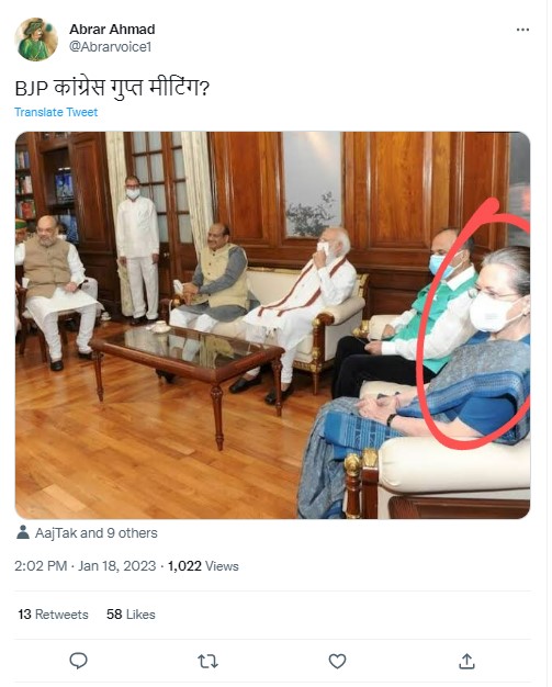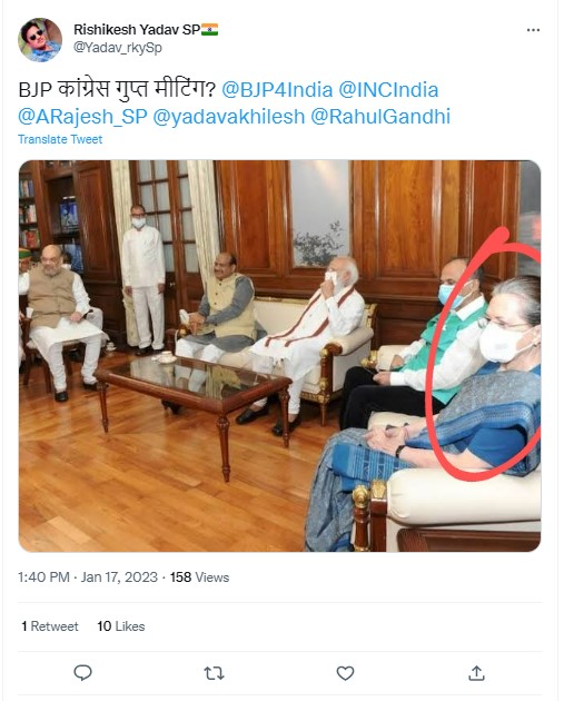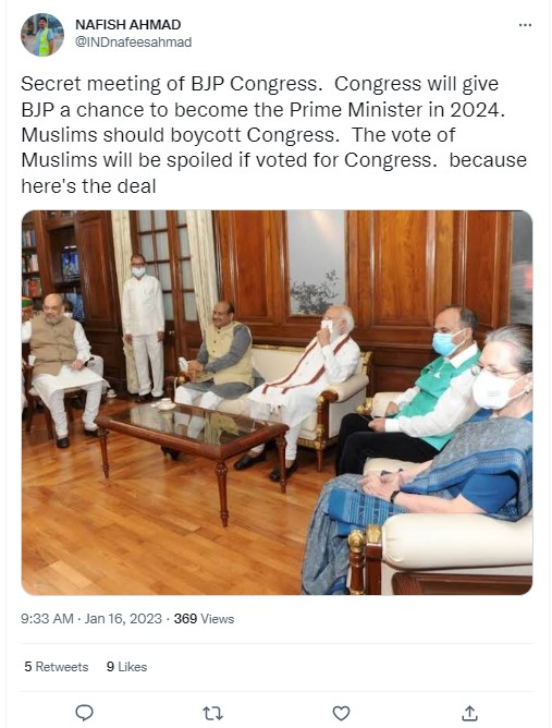 Twitter user @INDnafeesahmad shared the photograph with the caption, “Secret meeting of BJP Congress. Congress will give BJP a chance to become the Prime Minister in 2024. Muslims should boycott Congress. The vote of Muslims will be spoiled if voted for Congress. because here’s the deal.”