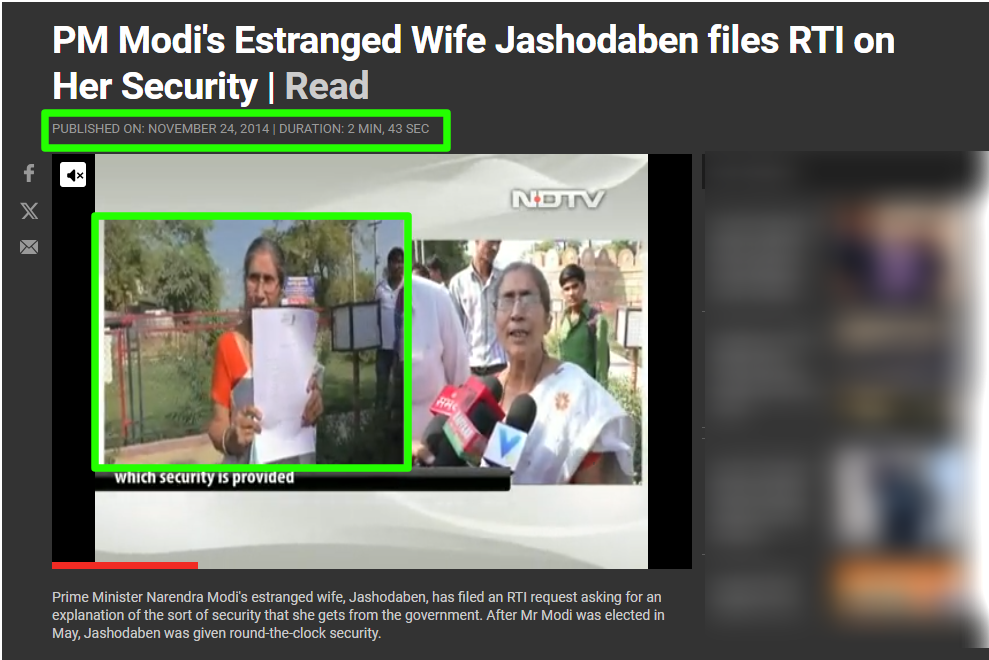 We looked up “Jashodaben,” “RTI” and “Protection” on Google, which yielded a video report by NDTV, dated November 24, 2014. The report stated, “Prime Minister Narendra Modi’s estranged wife, Jashodaben, has filed an RTI request asking for an explanation of the sort of security that she gets from the government. After Mr Modi was elected in May, Jashodaben was given round-the-clock security.”
