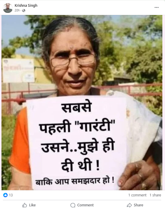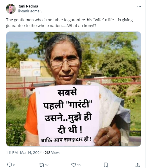 Now, an alleged photograph of Jashodaben, the estranged wife of PM Modi, holding a placard saying “He gave the first guarantee to me, you are wise enough,” has been widely shared on social media platforms. Multiple users shared the image insinuating that Jashodaben is targeting ‘Modi ki guarantee.’ Newschecker found that the image has been digitally altered.