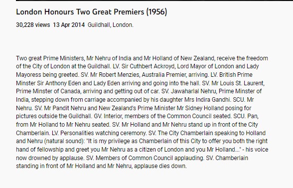 The description of the video reads, “Two great Prime Ministers, Mr Nehru of India and Mr Holland of New Zealand, receive the freedom of the City of London at the Guildhall… The City Chamberlain speaking to Holland and Nehru (natural sound): “It is my privilege as Chamberlain of this City to offer you both the right hand of fellowship and greet you Mr Nehru as a citizen of London and you Mr Holland…” – his voice now drowned by applause…”
