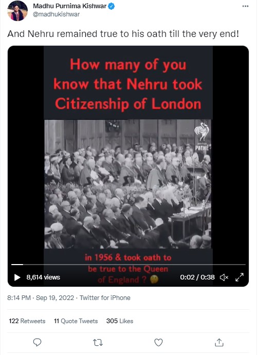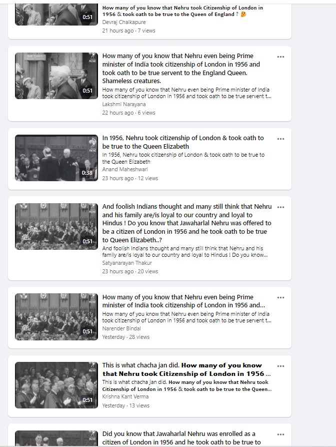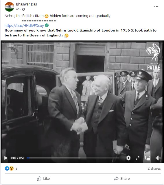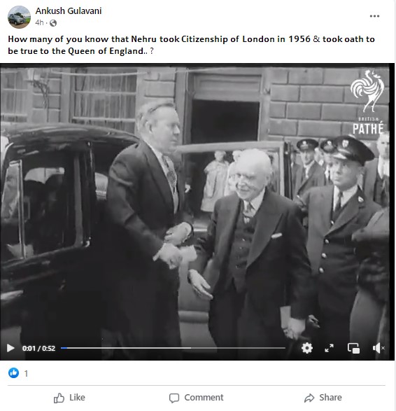 Several Twitter and Facebook users shared the video with the caption “How many people know that Nehru took citizenship of London in 1956 and took oath to be true to the Queen of England?”