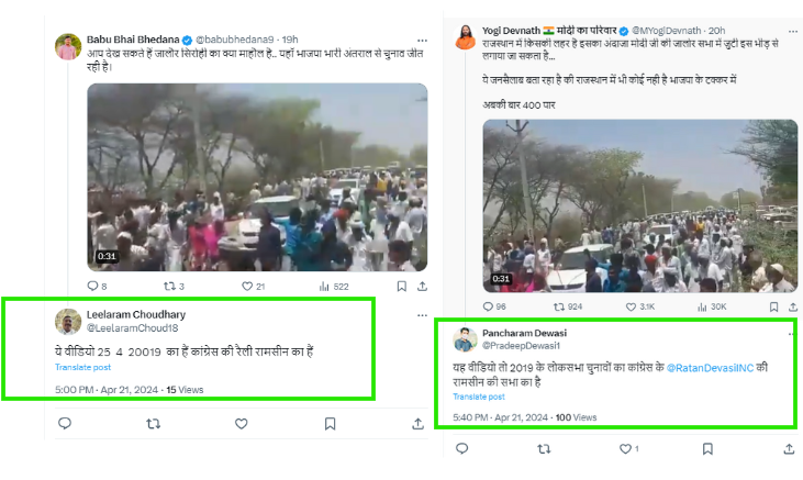 We skimmed through the comment sections of X posts carrying the viral footage, and found multiple users pointing out that the video is actually from a 2019 Congress rally in Ramseen, Jalore.